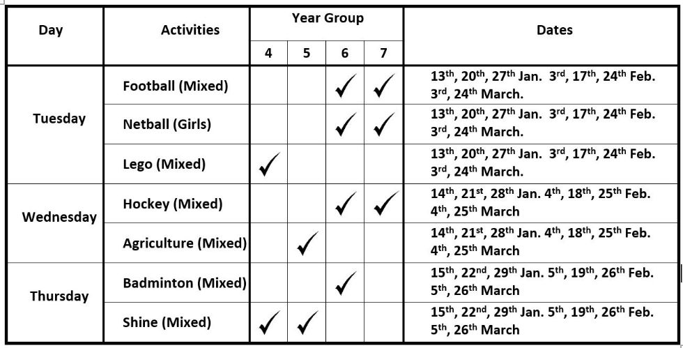 Yr 5&6 Football Yr 5 Badminton Yr 6&7 Shine Yr 4 Nature Club